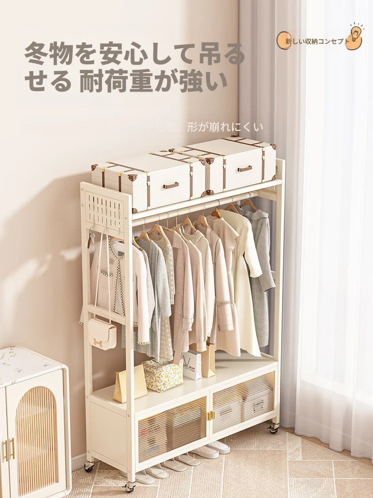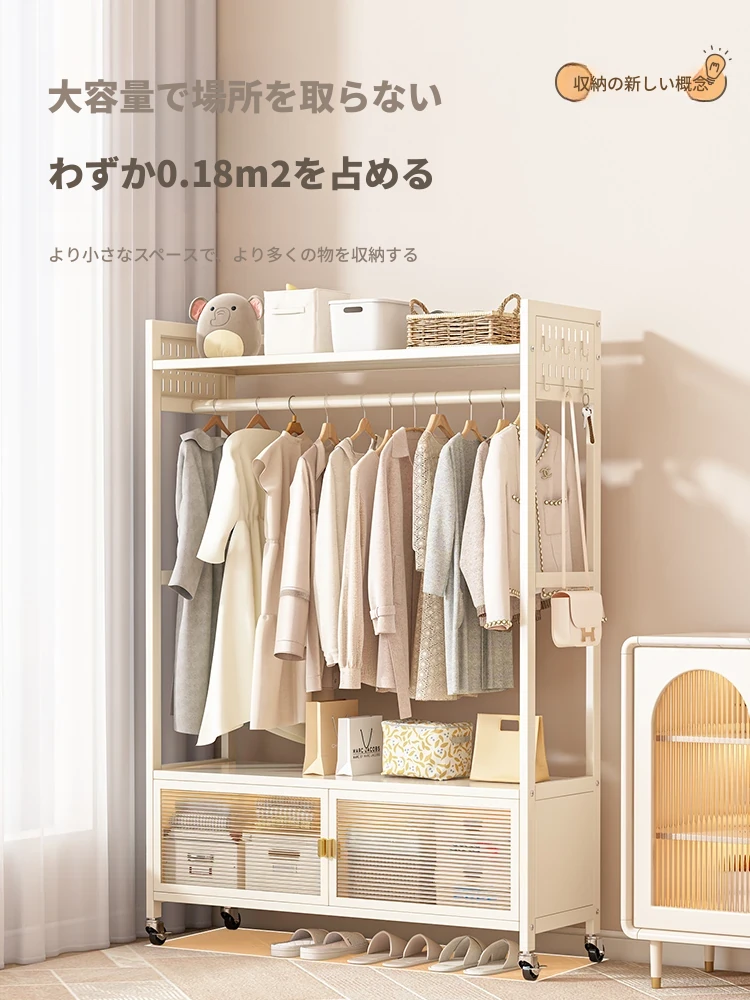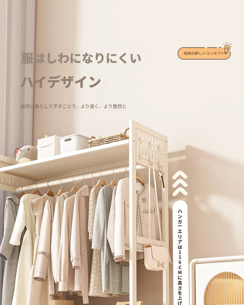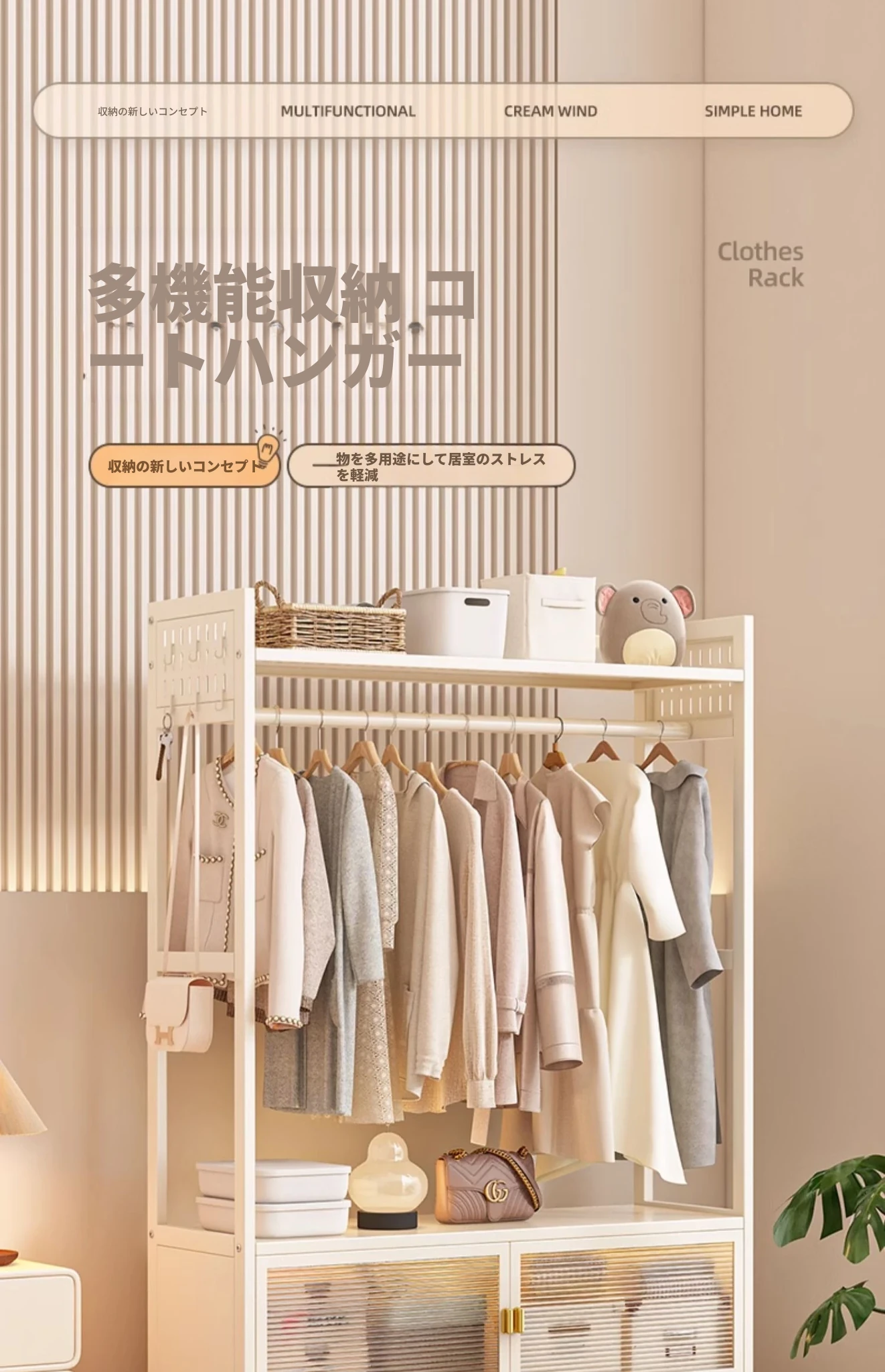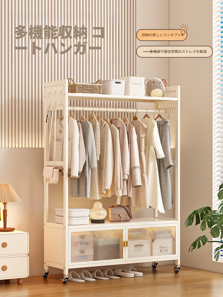 2025年新作!軽奢感漂う落地式衣類ハンガー - おしゃれなオープンキャビネットとクリーム風デザインで、寝室をスタイリッシュに演出!収納力抜群の穴あきボード付きコートラック。