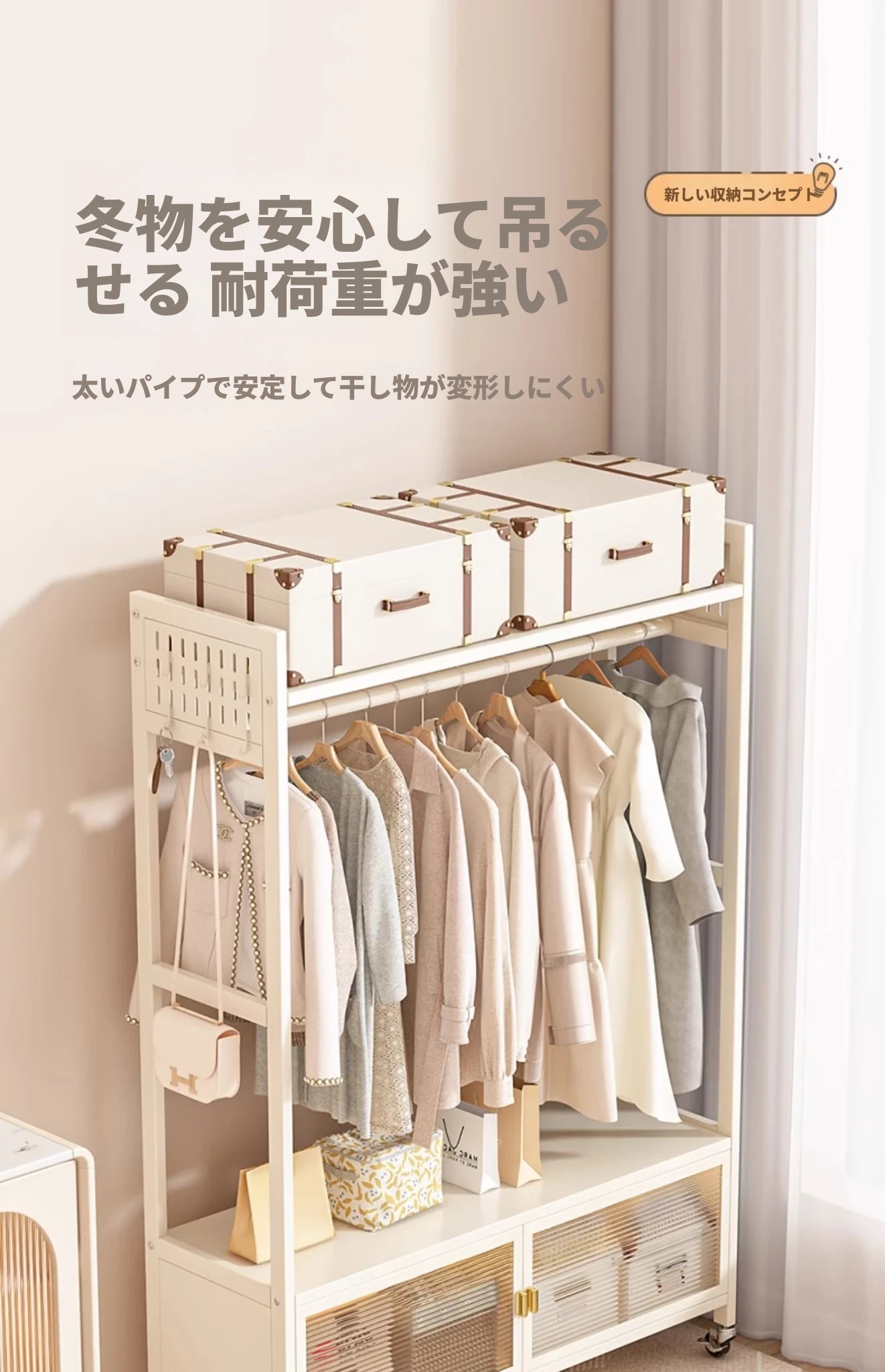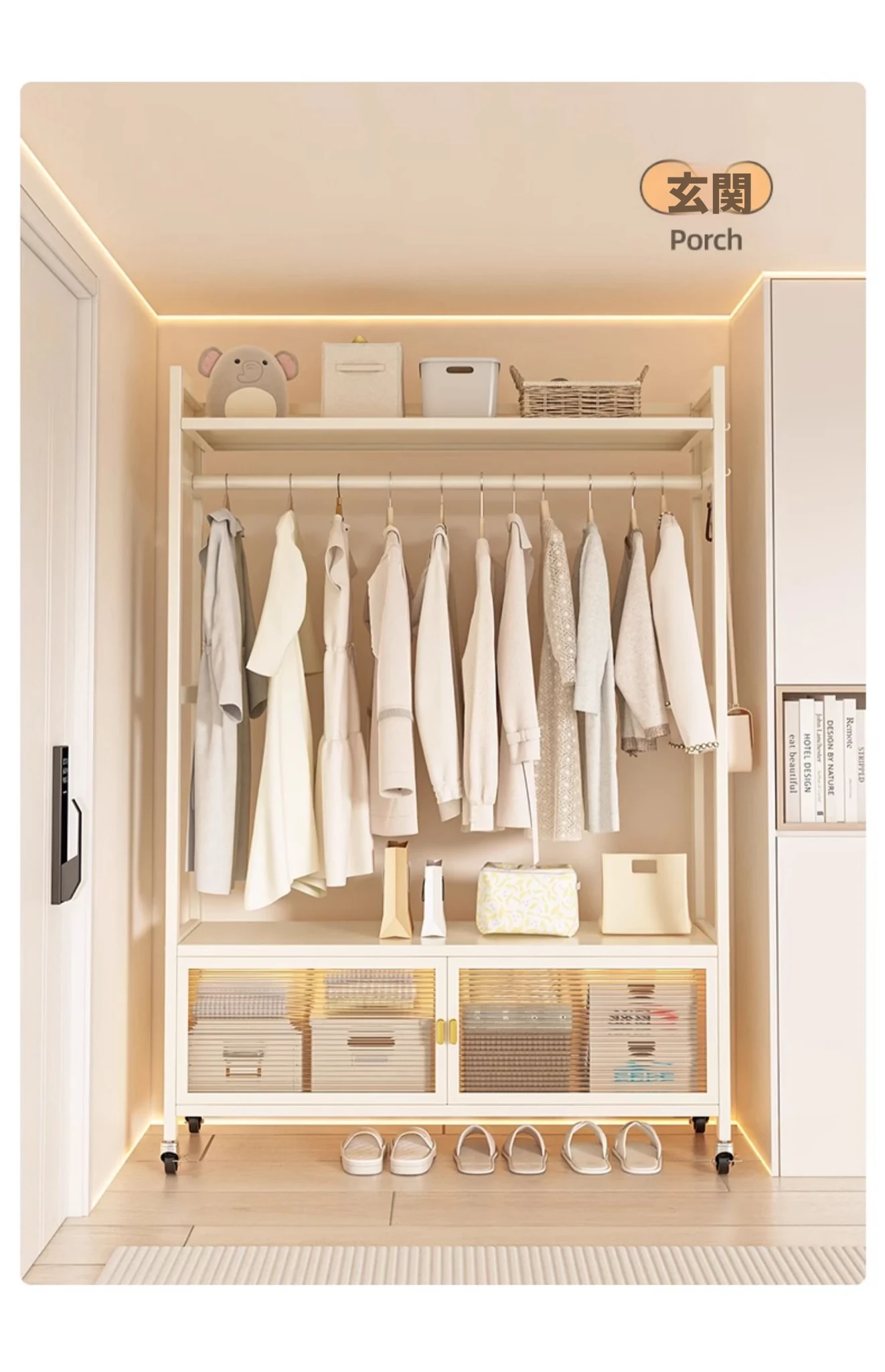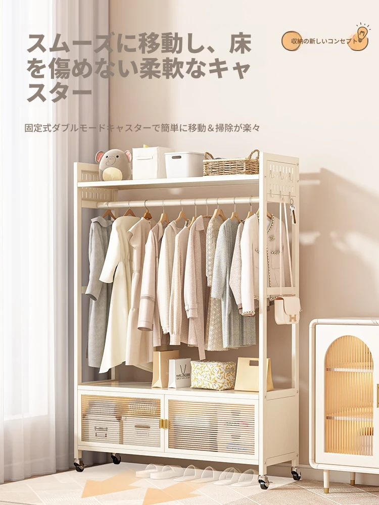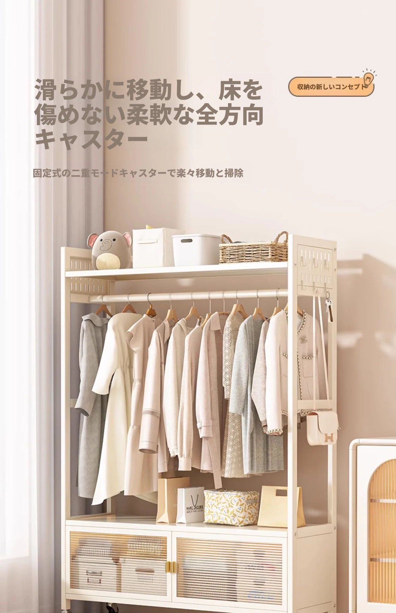 2025年新作!軽奢感漂う落地式衣類ハンガー - おしゃれなオープンキャビネットとクリーム風デザインで、寝室をスタイリッシュに演出!収納力抜群の穴あきボード付きコートラック。