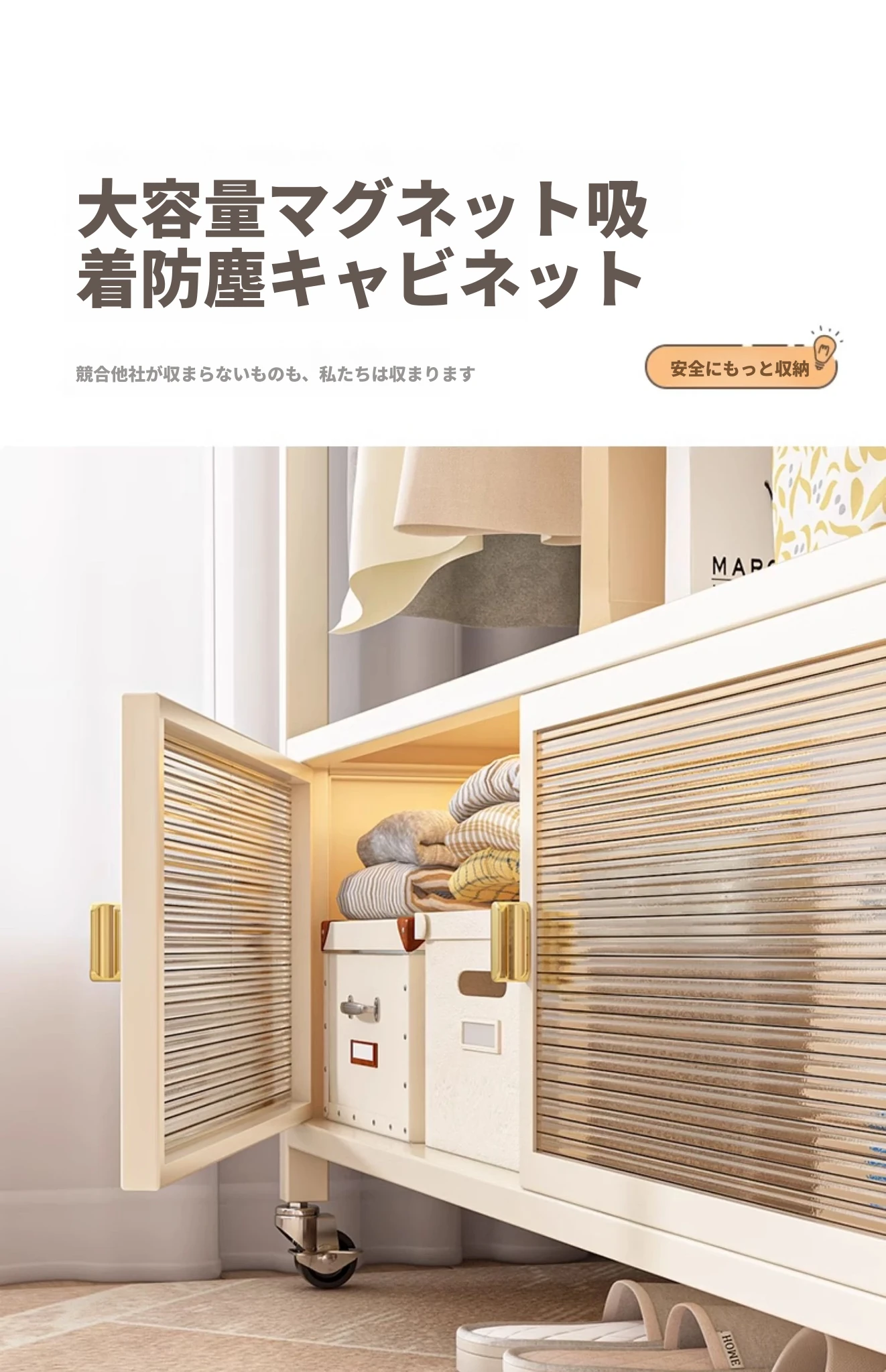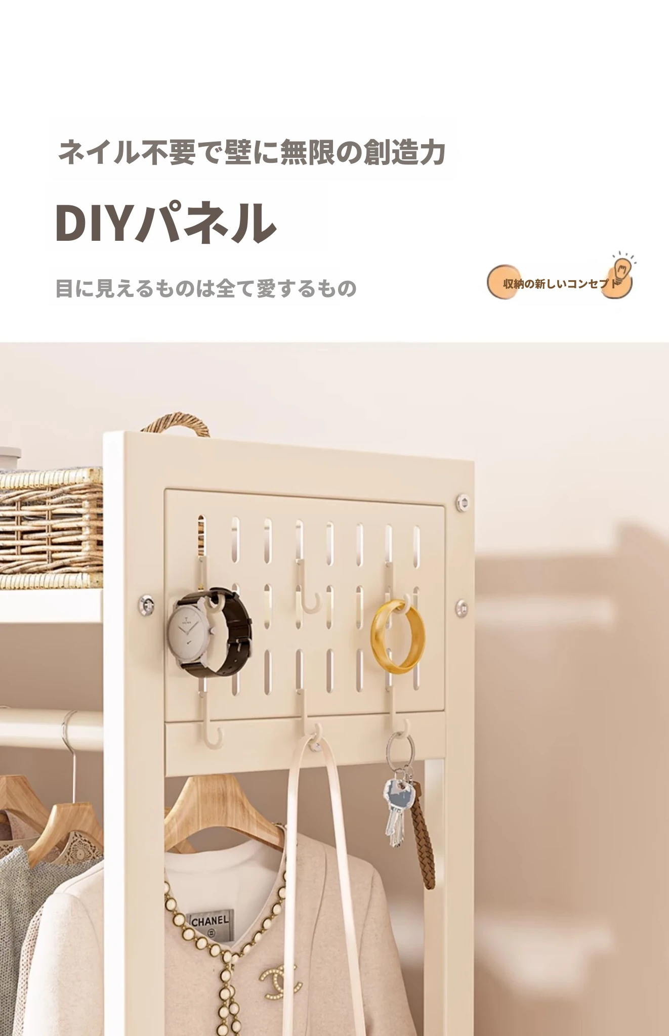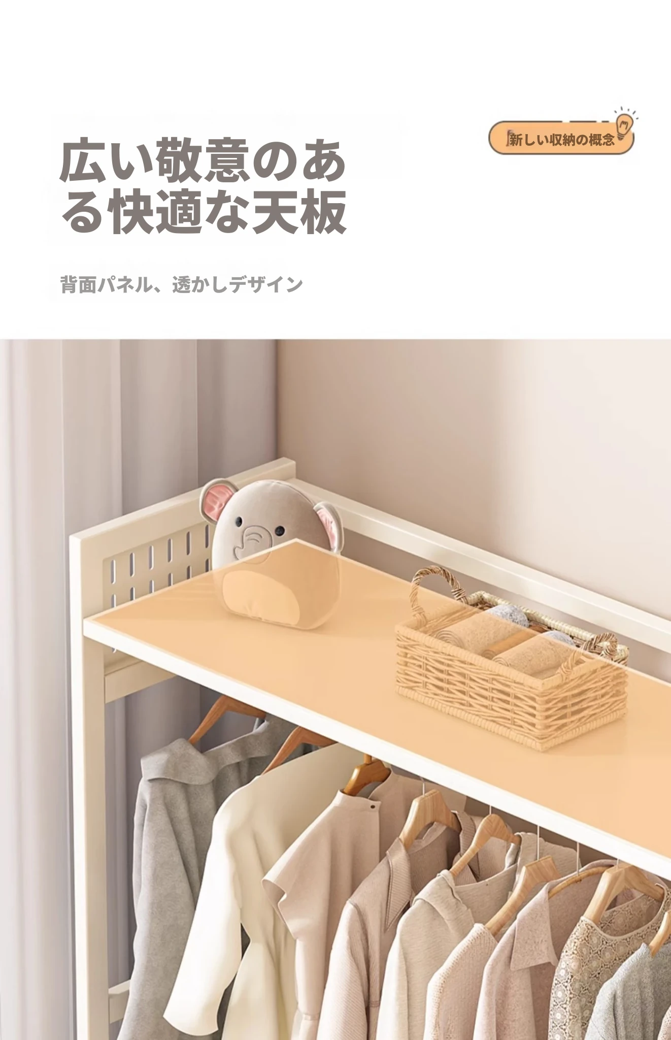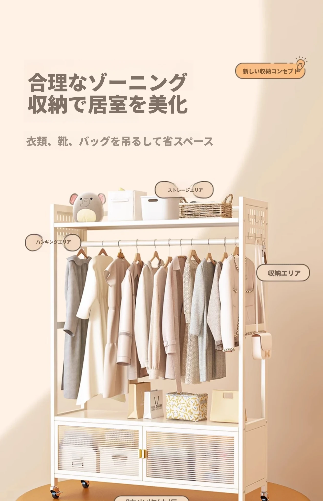 2025年新作!軽奢感漂う落地式衣類ハンガー - おしゃれなオープンキャビネットとクリーム風デザインで、寝室をスタイリッシュに演出!収納力抜群の穴あきボード付きコートラック。