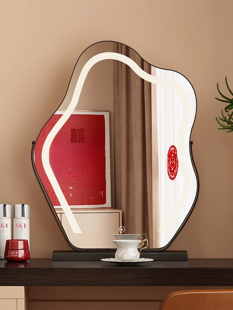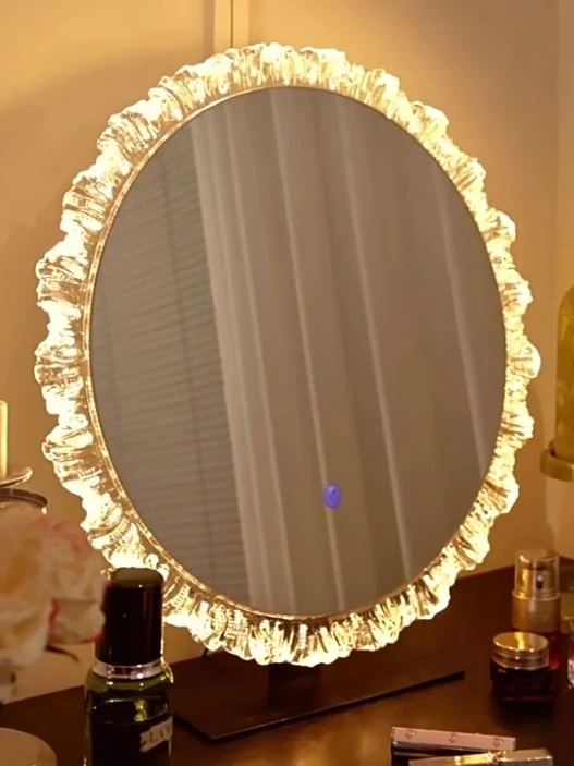 ライト付きフレンチデザインの卓上LED化粧鏡 - おしゃれで機能的なアクリル製、主寝室にもぴったりなユニークな形状!お肌を美しく照らし、毎日のメイクアップを特別な時間に演出します。