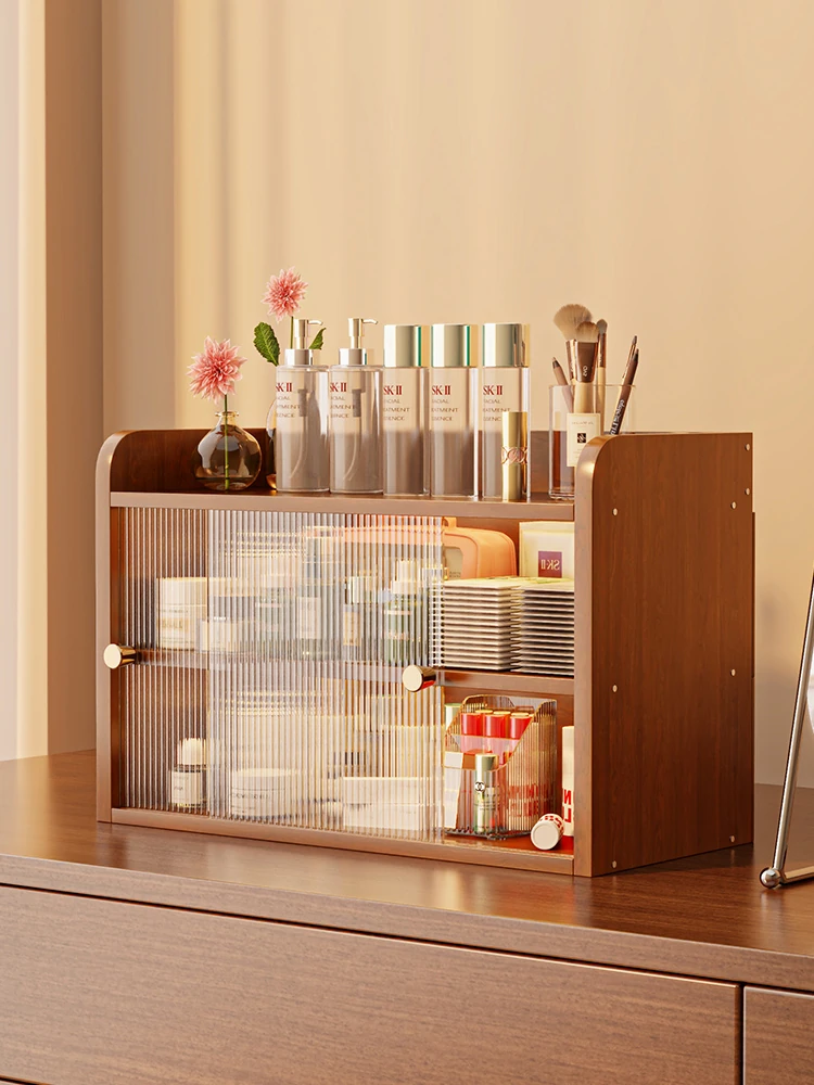 レトロな無垢材デスクトップドレッサー|スキンケア&コスメ収納ラック|多層リップ&香水整理棚で美をスマートに!